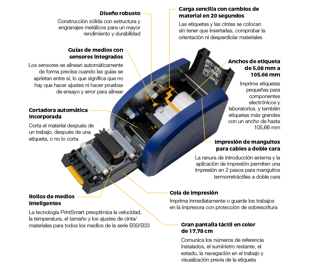 - Impresión de precisión: ambos modelos de 300 y 600 ppp se alinean y se imprimen en etiquetas de tamaño reducido de hasta 5,08 mm